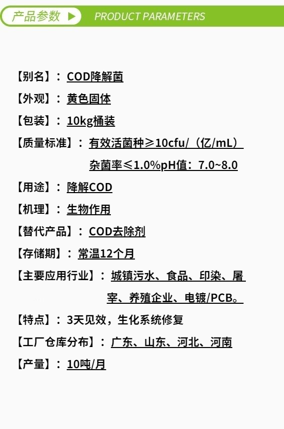 庫巴魯®COD激活菌301是針對(duì)生化系統(tǒng)中COD專門研發(fā)的高效COD去除菌,能降解廢水中的蛋白質(zhì)、淀粉、纖維素、糖類、油脂等碳?xì)浠衔铮嵘齼?yōu)勢(shì)菌群,有效抑制病原性微生物的繁殖。推薦閱讀:《滲濾液COD去除劑—清源牌》