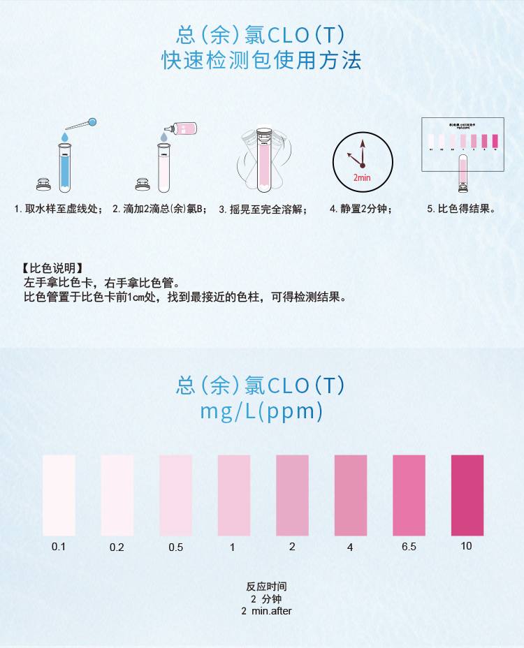 2、本產(chǎn)品檢測水中總(余)氯ClO(T)含量在0~10mg/L(ppm)范圍內(nèi),濃度過高會(huì)產(chǎn)生紅色沉淀而影響比色,若要檢測10mg/L以上濃度水樣,請預(yù)先稀釋水樣后再進(jìn)行測定,具體操作見稀釋說明書。。