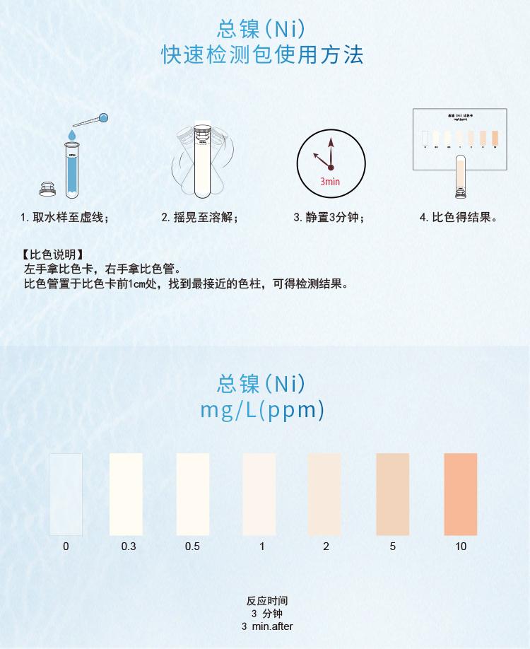 2.本產(chǎn)品檢測(cè)水中鎳離子(Ni2+)含量在0-5mg/L(ppm)范圍內(nèi),濃度過(guò)高會(huì)產(chǎn)生紅色沉淀而影響比色,若要檢測(cè)5mg/L以上濃度水樣,請(qǐng)預(yù)先稀釋水樣后再進(jìn)行測(cè)定,具體操作見(jiàn)稀釋說(shuō)明書(shū)。
