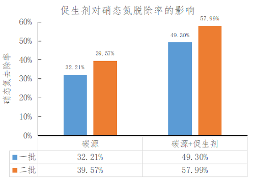 促生劑對(duì)反硝化脫氮的促進(jìn)作用:以某廠化工污水生化處理過程中的脫氮效果為例,添加水體十萬分之一的促生劑能夠提升17.09%-18.42%的硝態(tài)氮脫除率。